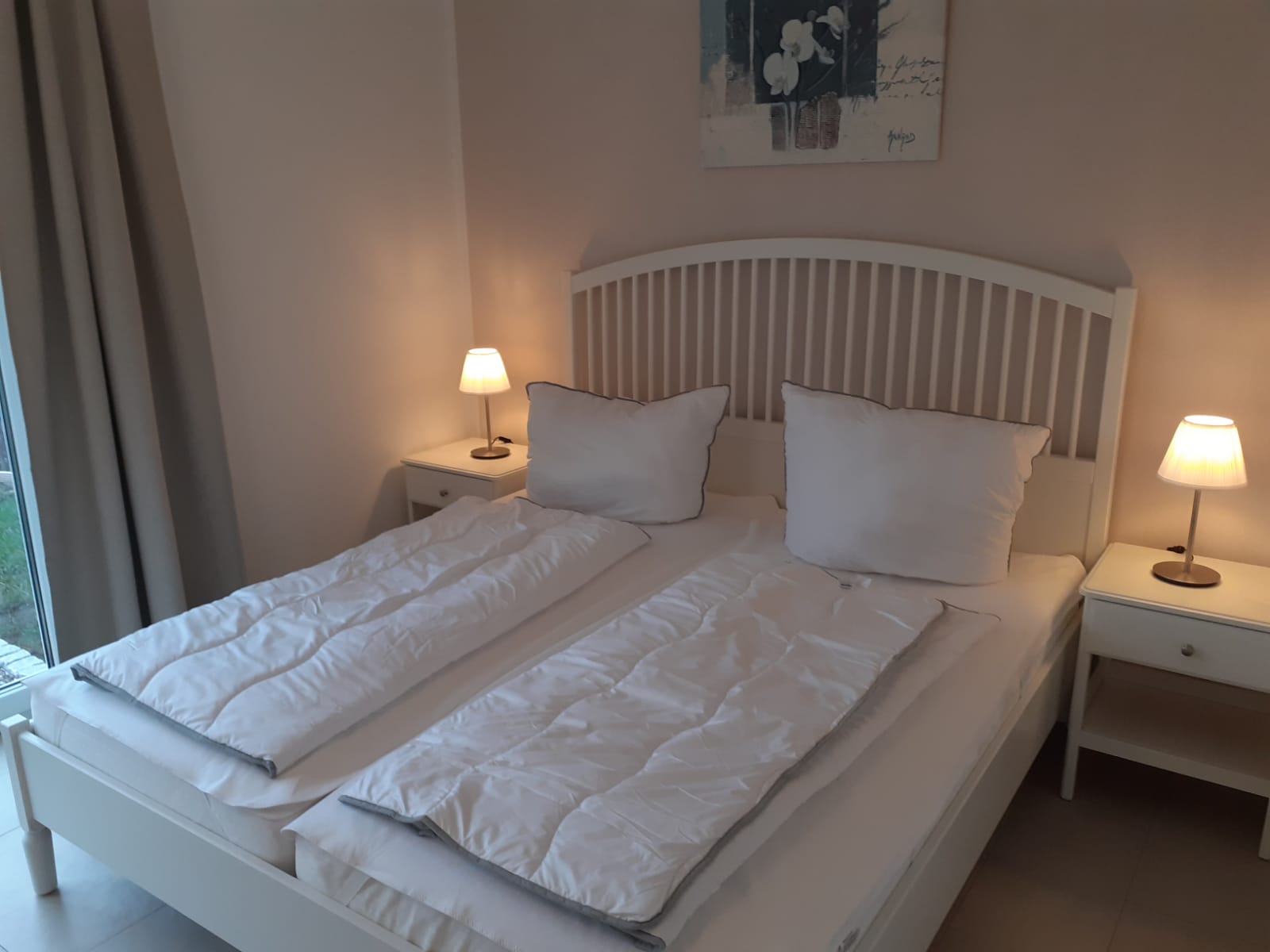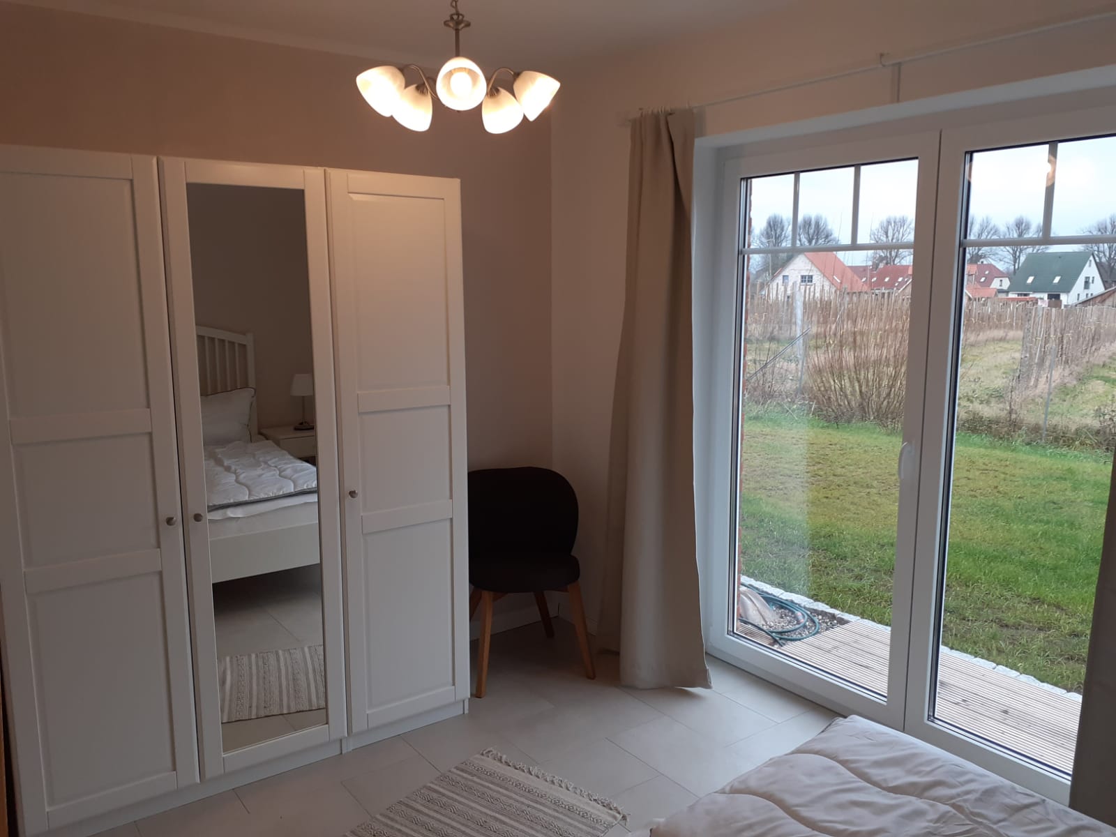 Ältere Gäste genießen im Erdgeschoss ein Schlafzimmer mit Doppelbett, direktem Gartenzugang und ein Duschbad.